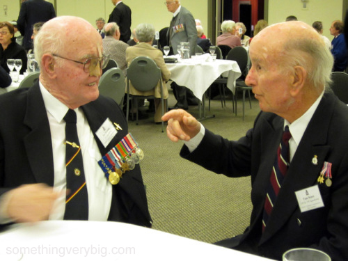 I first met Pat at the Bomber Command Commemorative Day weekend in Canberra  in June 2011. He was engaged at the time in a lively conversation with another veteran (Tommy Knox, a 149 Squadron Stirling flight engineer) about a mutual acquaintance both had known during the war, and I took a photo of them both in the midst of it: