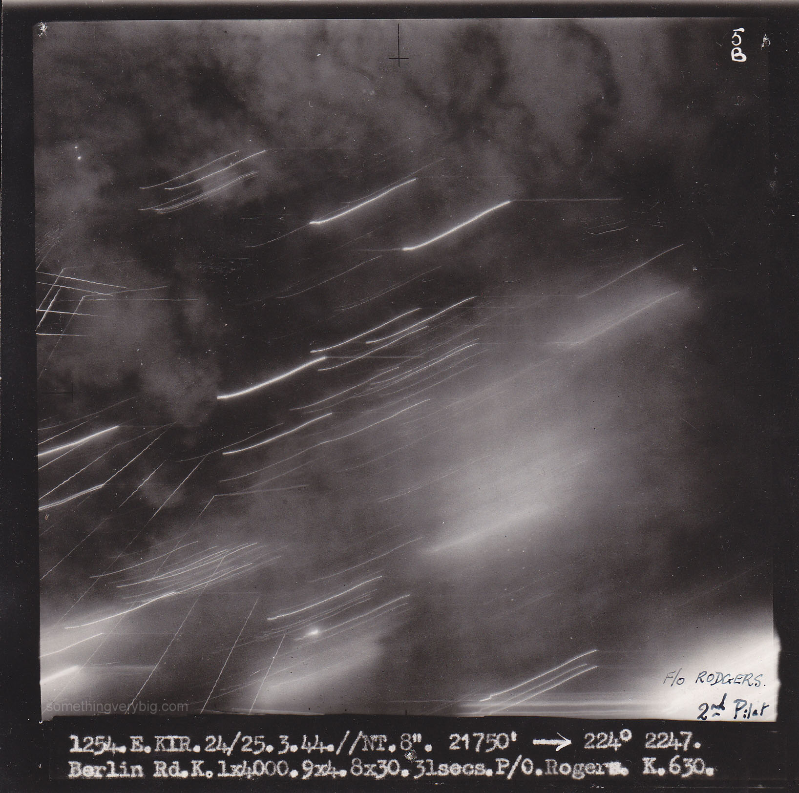 The battle raged on. A small number of German fighters were shot down by either Serrate Mosquitos or by bombers, but the scoreboard was otherwise woefully lopsided. By the end of the Long Leg, fifty nine bombers lay blazing on the ground along the route. All had been shot down in the hour after midnight. “It is unlikely that a single hour, before or since, has seen a greater rate of aerial destruction,” wrote Middlebrook.[15] Some pilots – among them Rollo Kingsford-Smith – recognised that with the contrails came great danger and willingly disobeyed orders by flying higher than briefed to get above the zone. “From there I could see a mass of contrails below us; they were like a formation of American day bombers,” said a 76 Squadron pilot who did the same thing.[16]