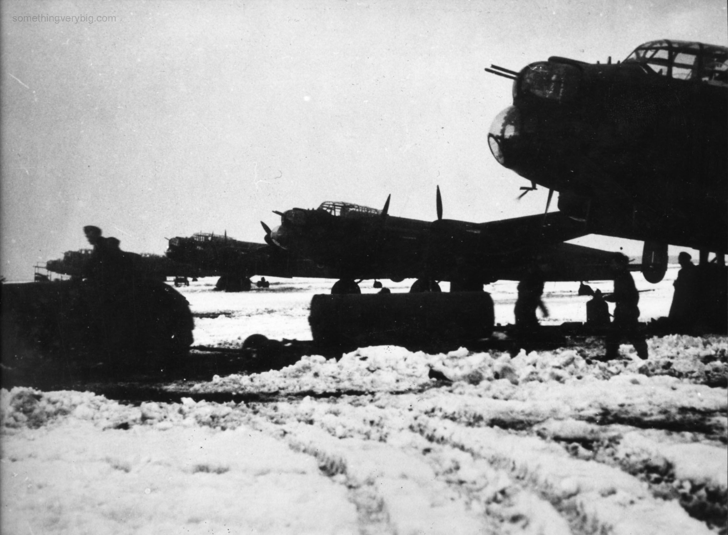 All available aircraft from 467 Squadron had taken off for this raid (the remainder being ‘Cat A.C.,’ or requiring repair by the manufacturer, according to the Operational Record Book). Three however made early returns, all due to problems with their starboard engines.[4] The Operational Record Book later attributed the three engine failures to the heavy snowfall creating difficulties for the engine fitters working at exposed dispersals.