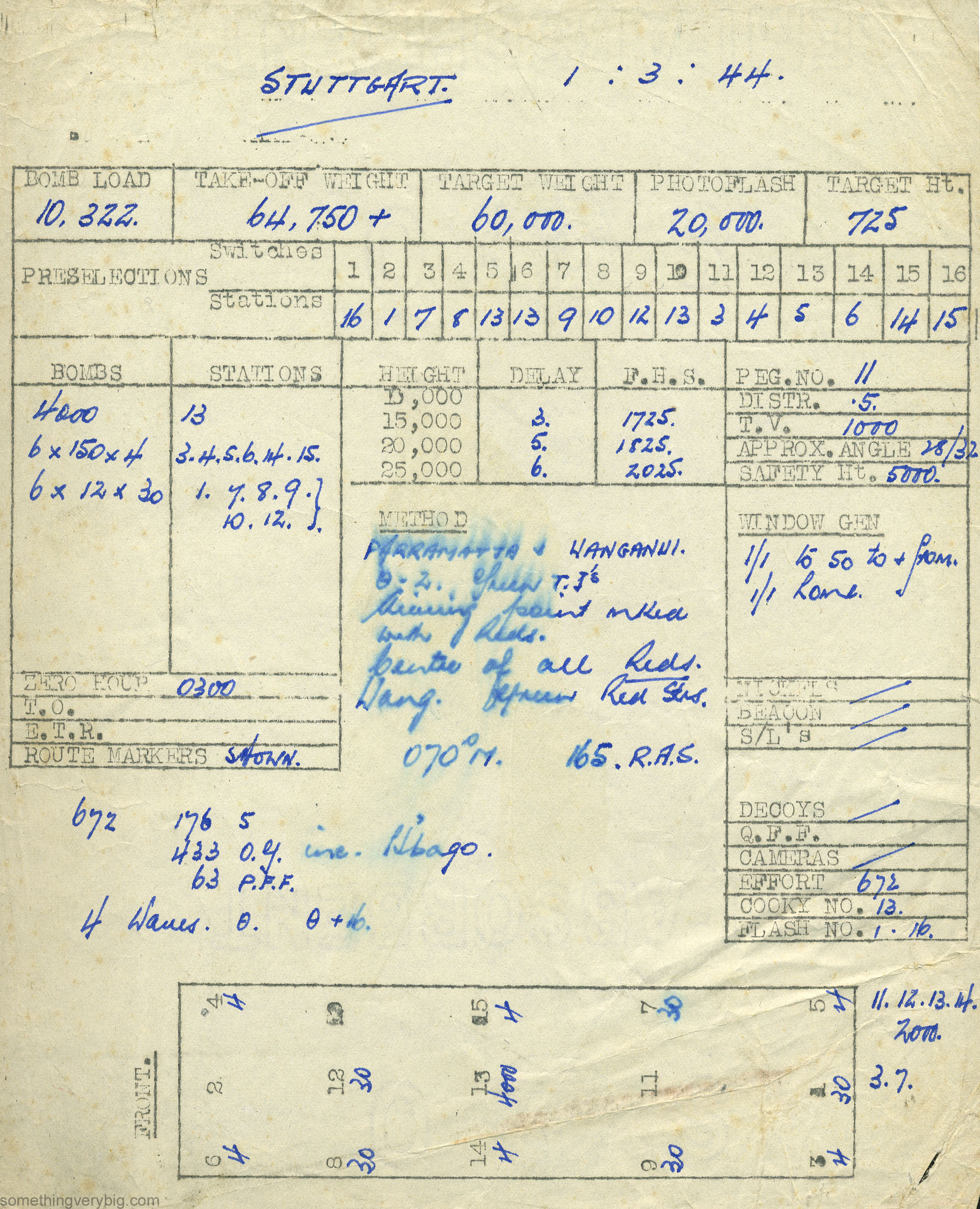 It was not considered practicable to use the ‘splitting’ tactics which had proven so useful in recent raids of this scale because a bright moon was expected to be above the horizon for the early part of the route to the target and strong winds were forecast for the return leg. Consequently the bomber stream was planned on a course keeping south of Strasbourg while the moon was up, and home on almost the shortest possible route.[2] Heavy cloud was forecast along most of the route and so a mixed Parramatta and Wanganui attack was planned using ground target indicators and airborne release-point flares, both dropped using H2S.