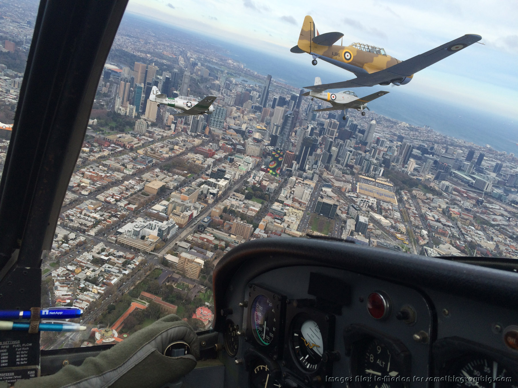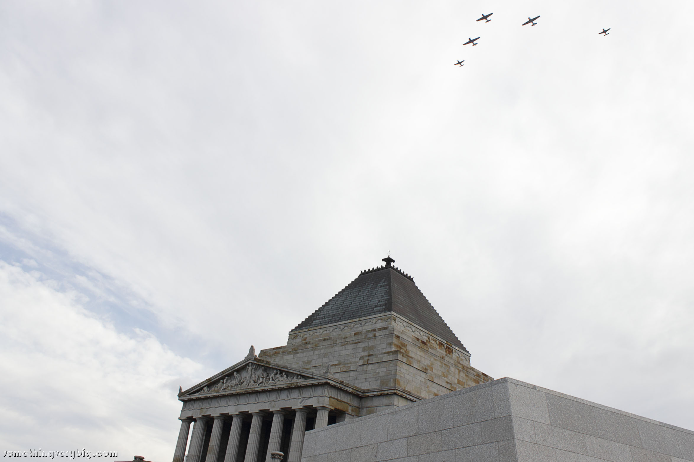 The Royal Victorian Aero Club formation passes the Shrine of Remembrance