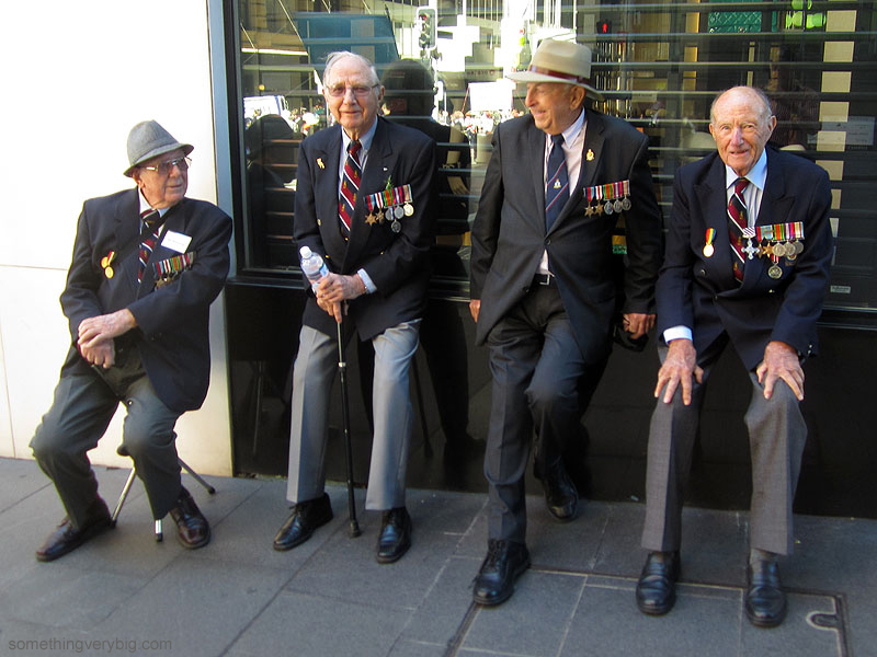 Only six veterans actually marched this year. Even the indefatigable Don Southwell was absent, having pulled a hamstring recently. He rode in an RSL-provided Land Rover instead. The rest of the bunch was made up by numerous families and friends of veterans, numbering perhaps a couple of dozen in all.