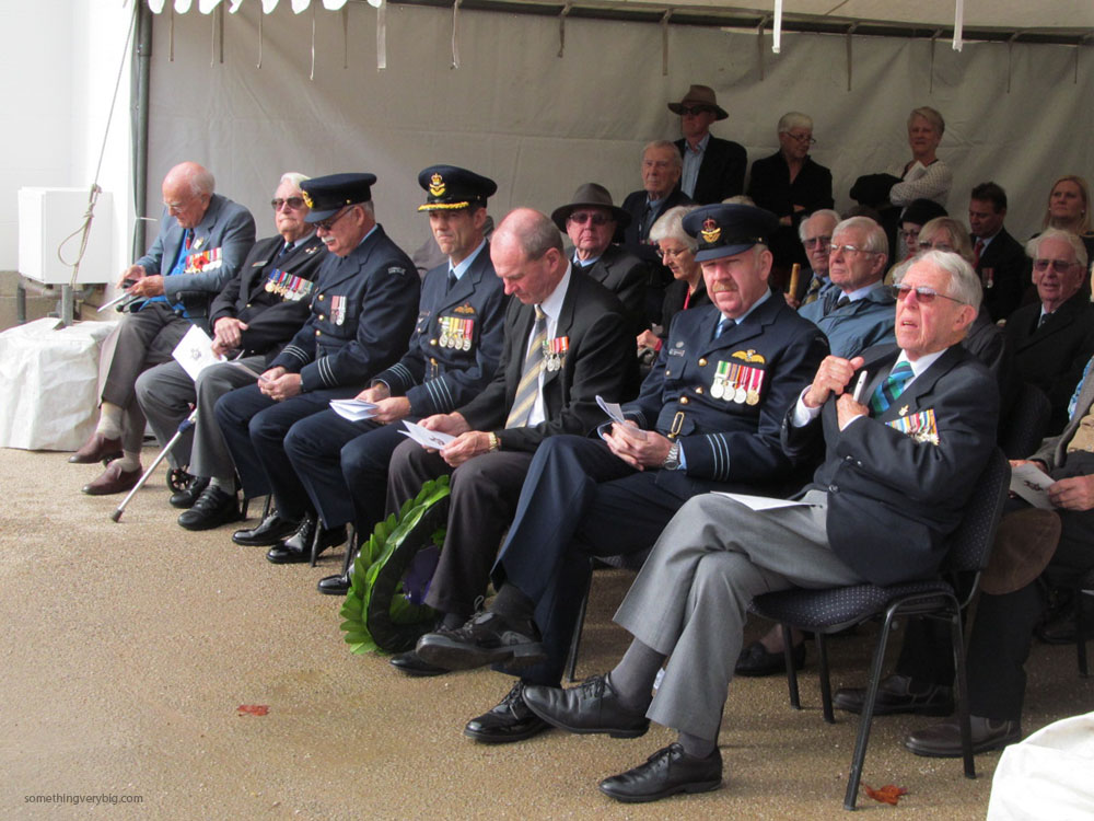 Attending the ceremony was His Excellency General the Honourable Sir Peter Cosgrove AK, MC (Ret’d), Governor-General of the Commonwealth of Australia, who spoke about how Australians in particular traveled so far from home to fly in Bomber Command. The veterans present were invited to move to the inside of the Hall of Memory to view the wreathlaying at the Tomb of the Unknown Soldier. Ross Pearson delivered the Reflections address, paying tribute to those unsung support staff who also served: the armourers, the WAAFs, the parachute packers, the cooks (who worked miracles to make Spam palatable), the briefing officers. He also spoke eloquently on the unique “spirit of aircrew,” reading the citation for the award of the Conspicuous Gallantry Medal to Kevin Dennis, the veteran I had met at the hotel the previous evening. Kevin was a wireless operator who, badly injured by flak during an operation in March 1945, refused to leave his post until the damaged aircraft landed safely. In considerable pain with one foot almost severed from the explosion he had continued to carry out his duties, receiving the critical weather message which resulted in a successful diversion to an emergency airfield. For this, in the process saving his entire crew, he was awarded the CGM, one small step below a Victoria Cross.